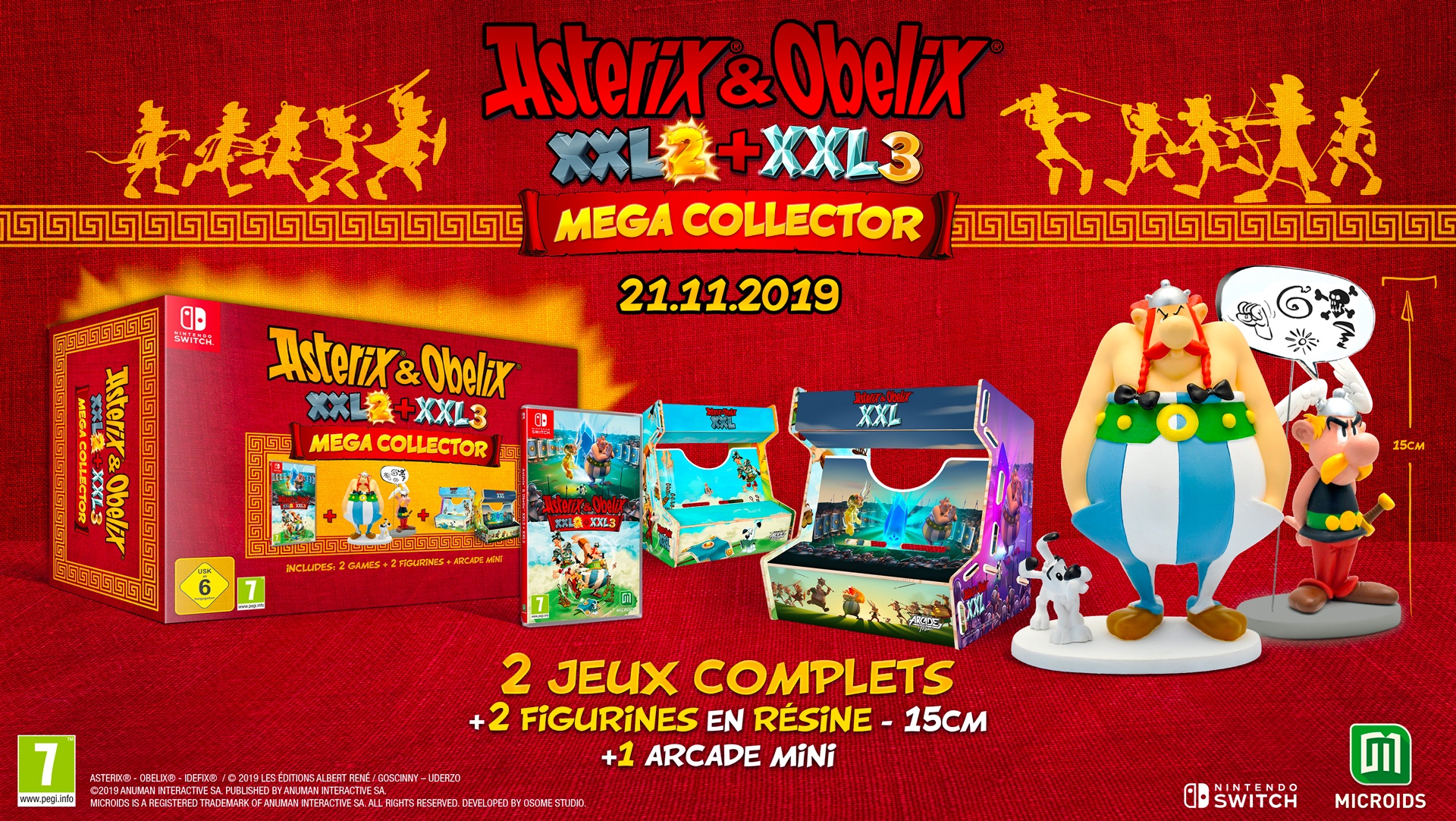 - L’édition Mega Collector, comprenant les jeux Astérix & Obélix XXL 3: Le Menhir de Cristal et Astérix & Obélix XXL 2, deux figurines de 15cm en résine de Obélix et Idéfix + Astérix, ainsi qu’une Arcade Mini avec les faces réversibles.