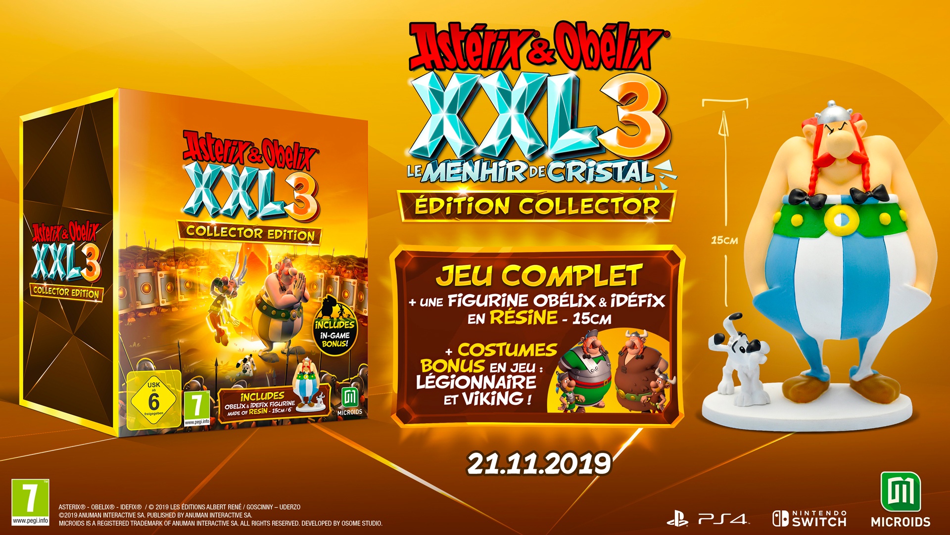 - Une édition collector, comprenant le jeu et une figurine en résine d’Obélix et Idéfix de 15cm, ainsi que deux packs de tenues pour Astérix et Obélix.
